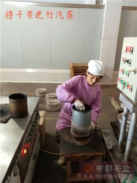 圖二是將稱量好的毛茶進行汽蒸,通過高溫使干茶變軟,蒸茶,把茶蒸軟,茶膠溶出,茶才能壓緊。