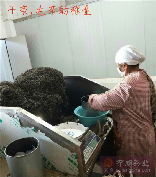 圖一是將曬青毛茶進行稱量,這一過程要求工人在稱量散茶的同時將毛茶裝入布袋中。